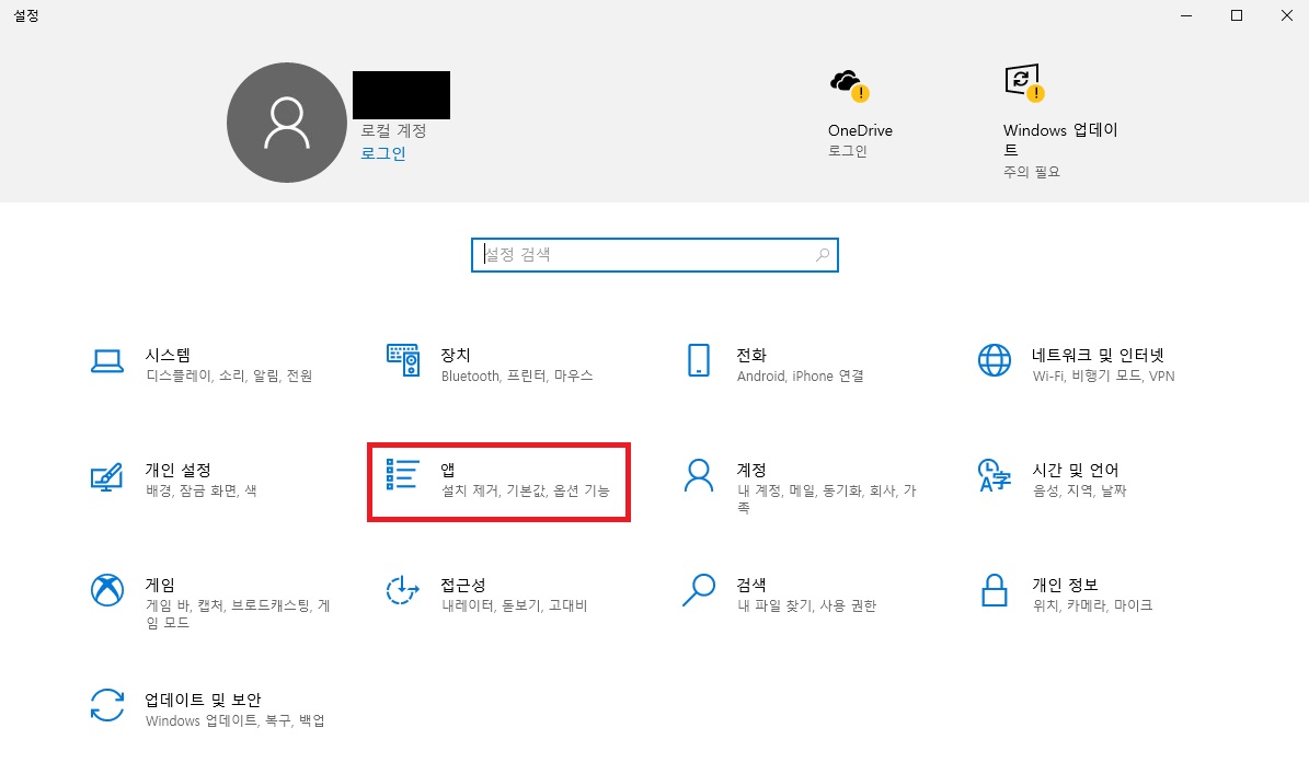 설정 창에서 [앱] 메뉴를 선택합니다.