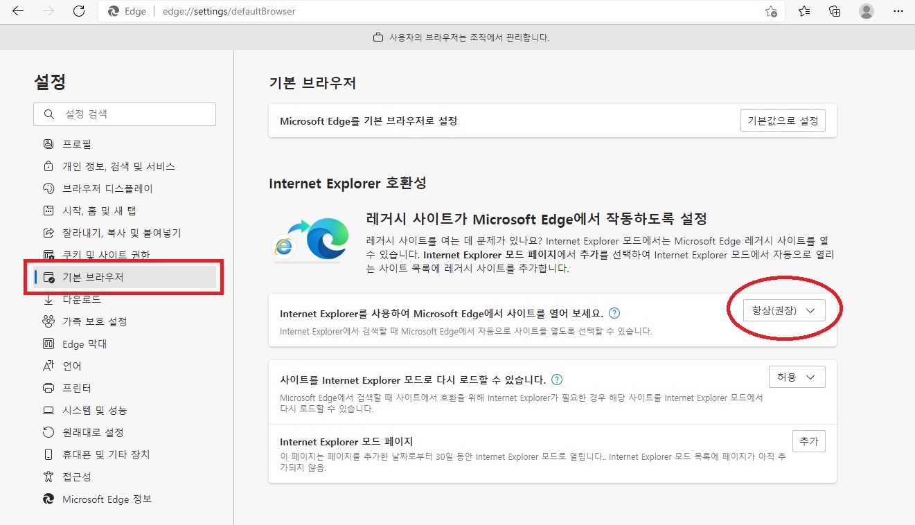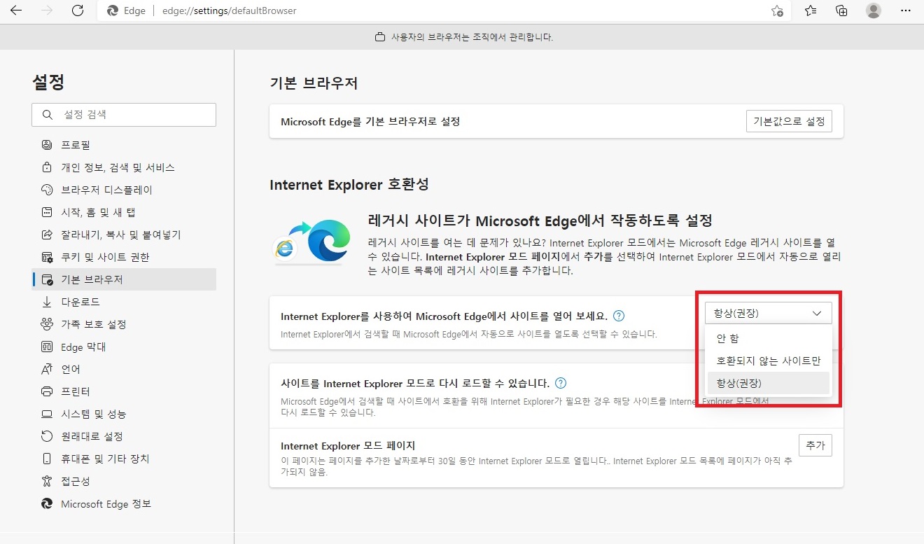 좌측 메뉴에서 [기본 브라우저]를 선택합니다. 'Internet Explorer를 사용하여 Microsoft Edge에서 사이트를 열어 보세요.' 항목이 [항상(권장)]으로 되어 있을 텐데요. 이를 선택하면 [항상(권장], [안 함], [호환되지 않는 사이트만] 중에서 선택하여 설정할 수 있습니다. 저는 [안 함]으로 선택하여 설정해보겠습니다.