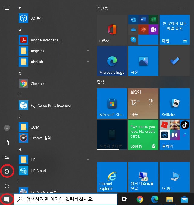 모니터 좌측 하단의 시작 버튼을 클릭하면 나타나는 메뉴 중 톱니바퀴(설정)를 선택합니다.