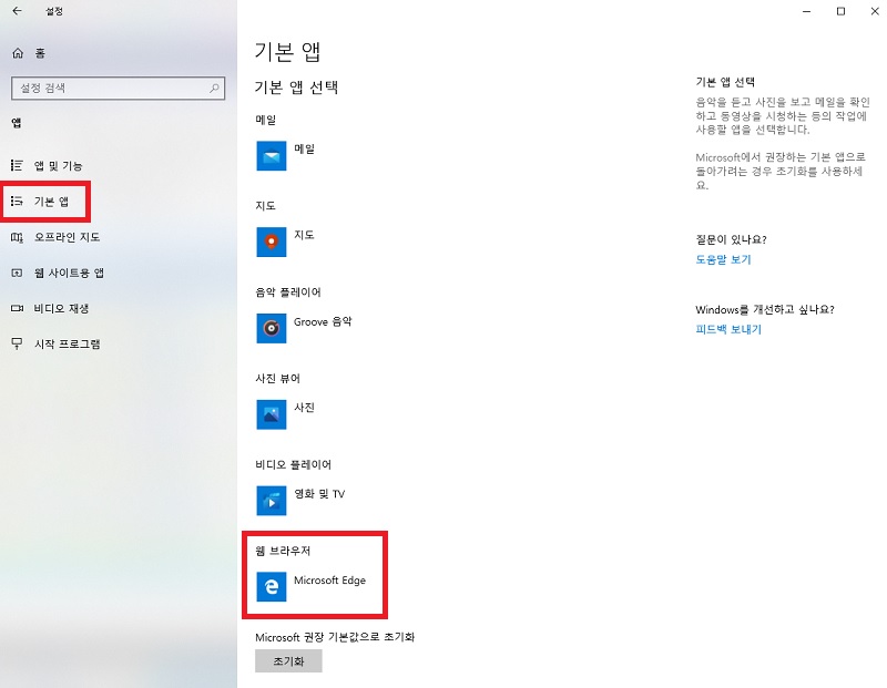 좌측 메뉴에서 [기본 앱]을 선택한 후, [웹 브라우저]를 선택합니다.