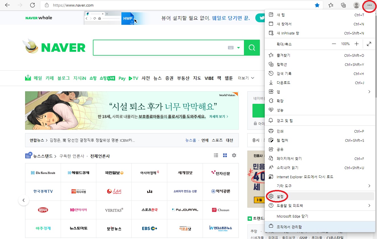 PC에서 엣지 브라우저를 실행합니다. 상단의 점 세 개를 선택하면 나타나는 메뉴 중에 [설정]을 선택합니다.