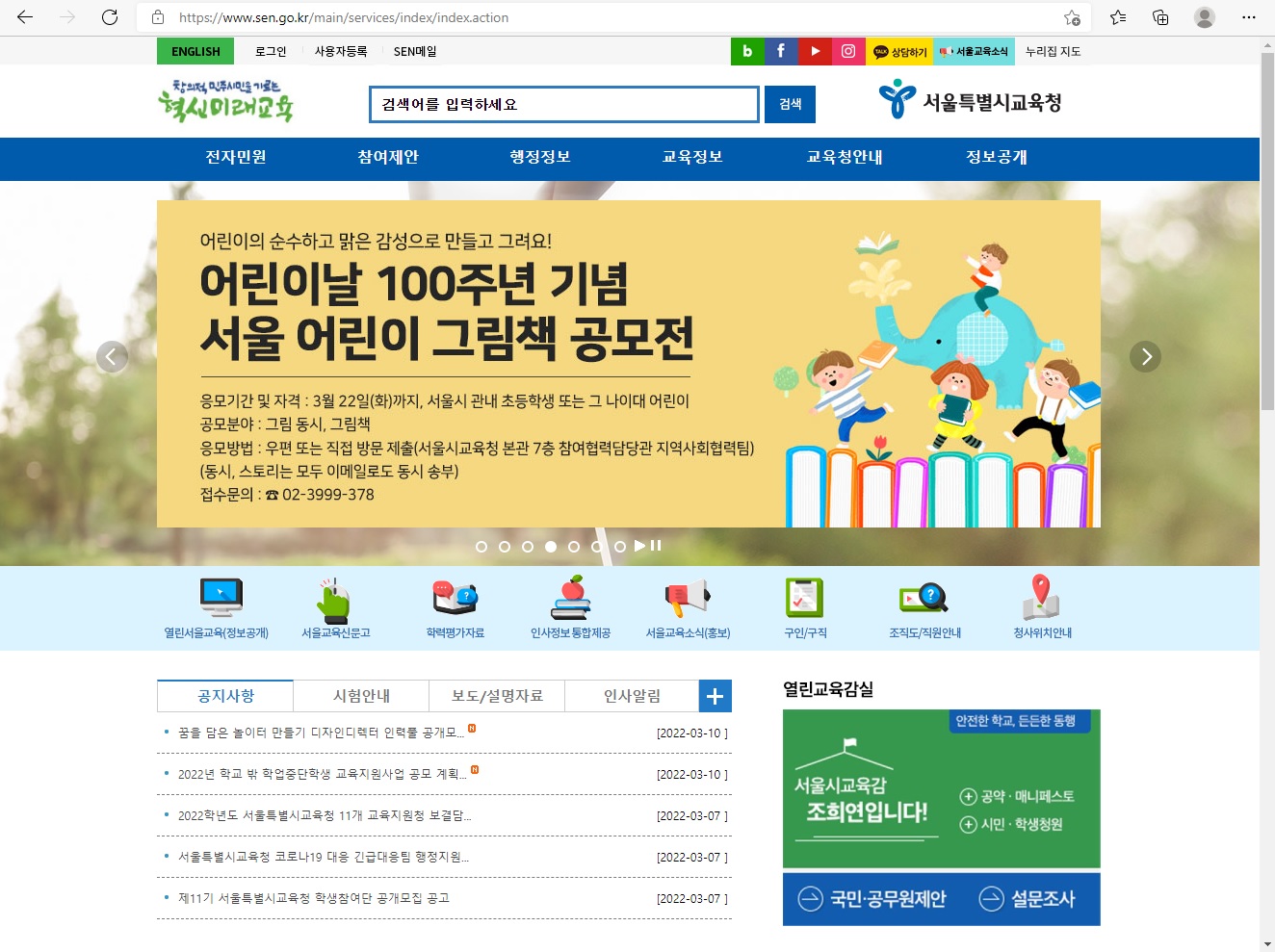 포털사이트에 [서울시 교육청]을 검색하거나, 아래 안내드리는 링크를 통해 서울시 교육청 홈페이지에 접속합니다.