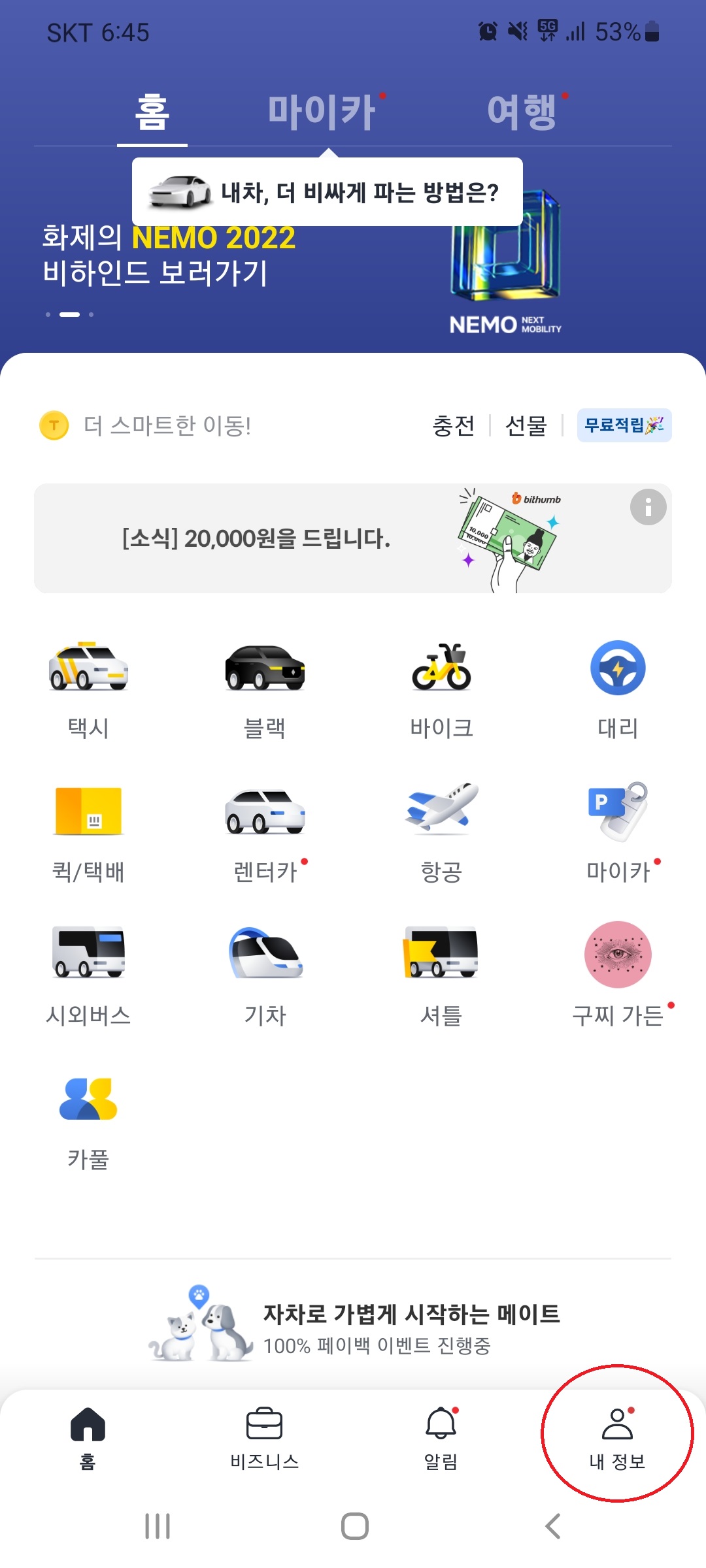 카카오택시 어플을 실행한 후, 화면 우측 하단의 [내 정보]를 선택합니다.
