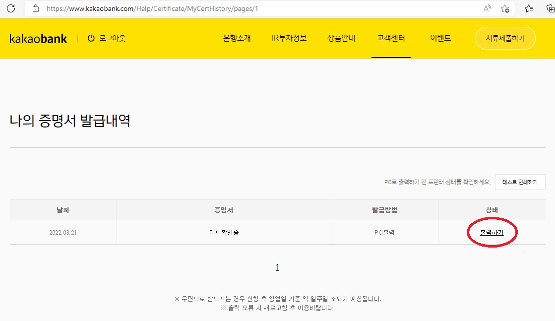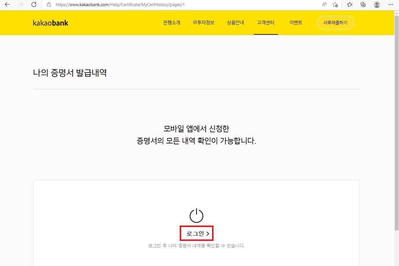 카카오뱅크 사이트 접속 후 상단의 [고객센터 > 나의 증명서 발급내역]을 선택합니다.