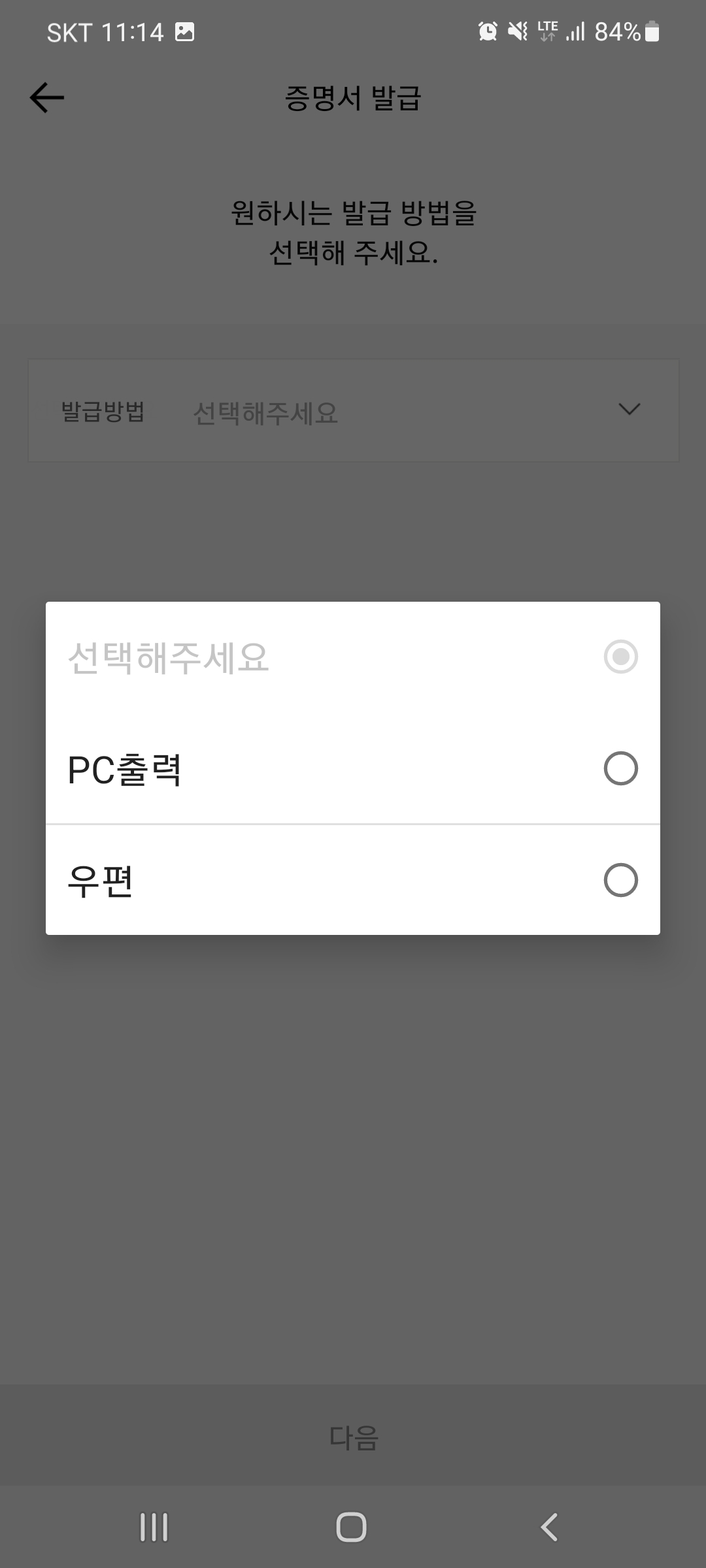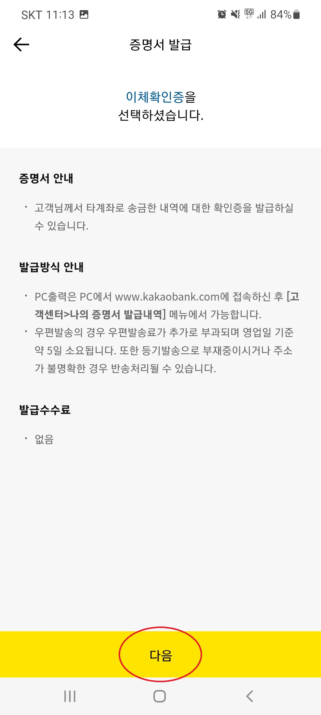 필요한 증명서 선택 후 하단의 [다음]을 선택합니다. 저는 이체확인증을 선택해봤습니다.