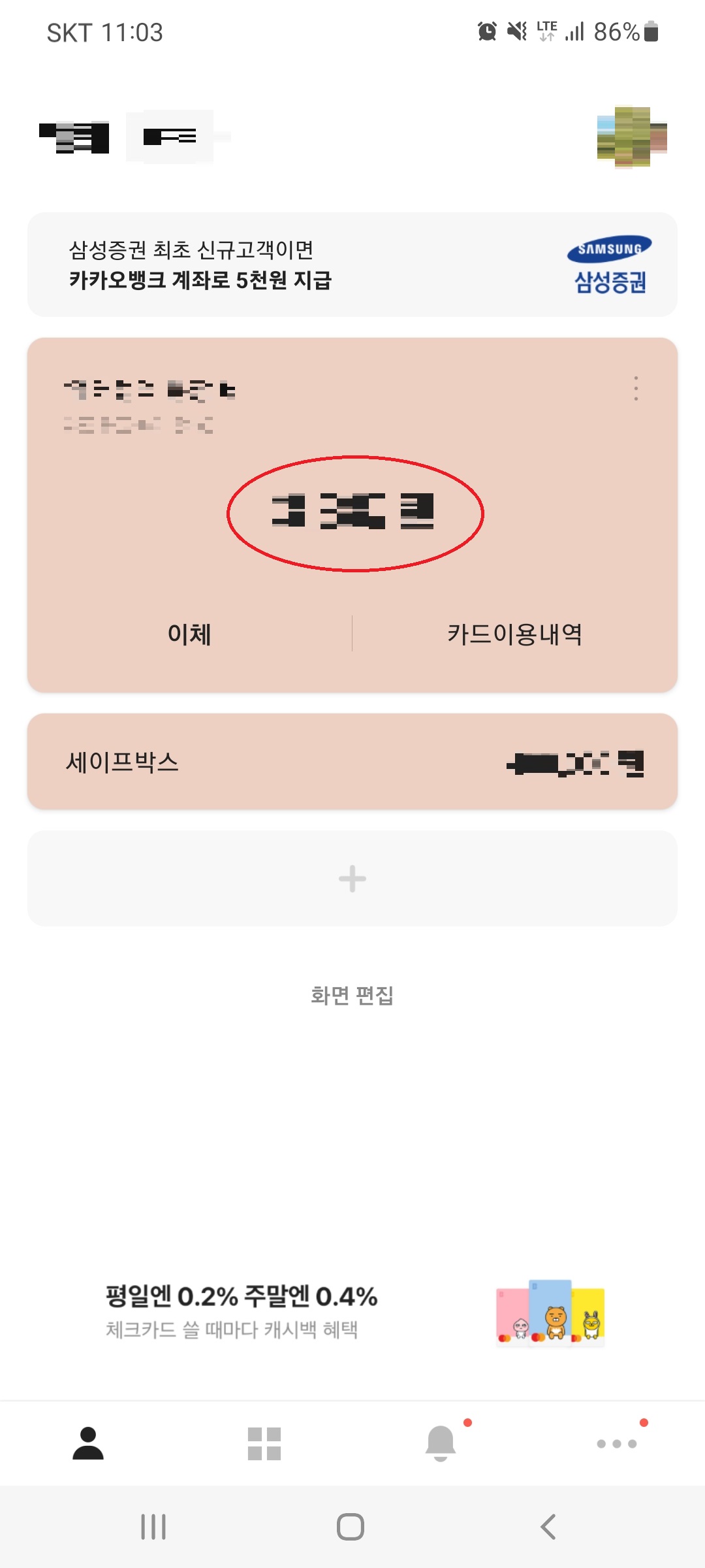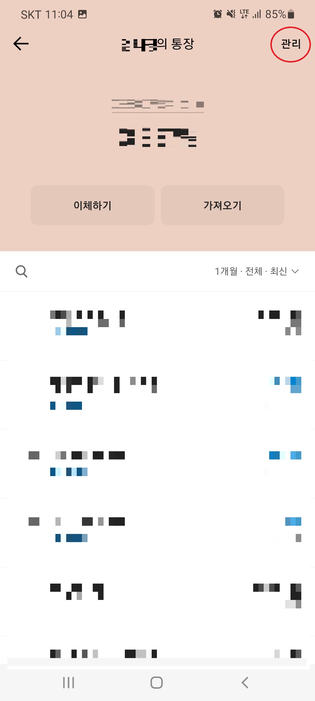 휴대폰에서 카카오뱅크 어플을 실행합니다. 메인 화면에 내 계좌의 잔액이 보일 텐데요. 잔액 부분을 선택한 후 다음 화면에서 우측 상단의 [관리]를 선택합니다.
