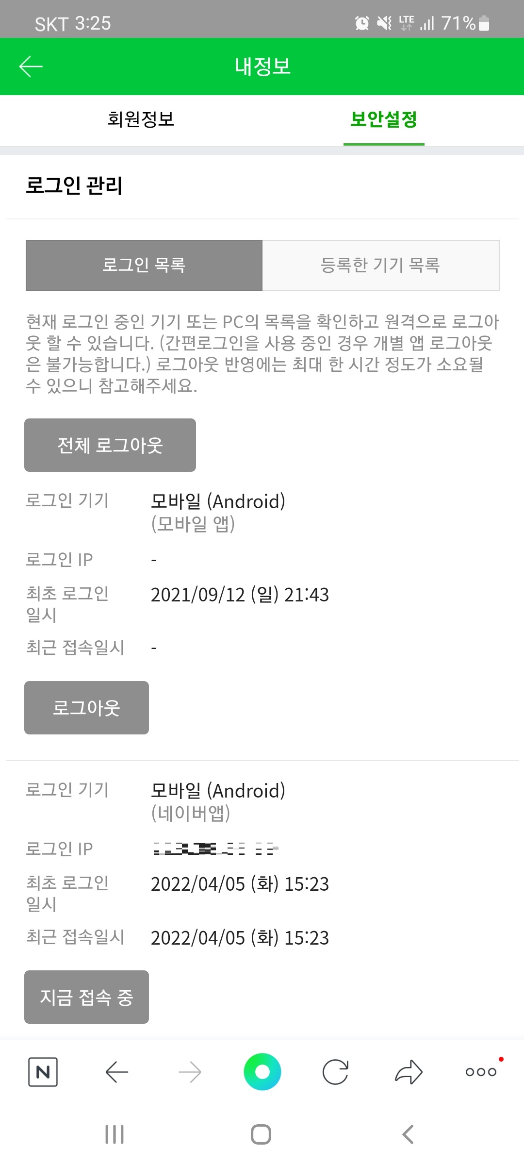 [전체 로그아웃]을 선택하여 현재 로그인 중인 모두를 로그아웃 하거나, 개별적으로 원하는 기기만 로그아웃 할 수 있습니다.