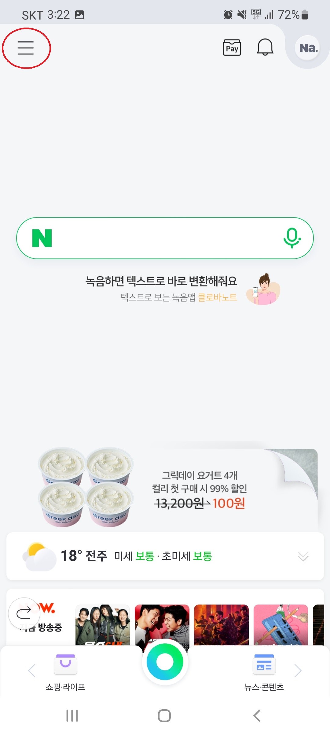 휴대폰에서 네이버 앱을 실행합니다.