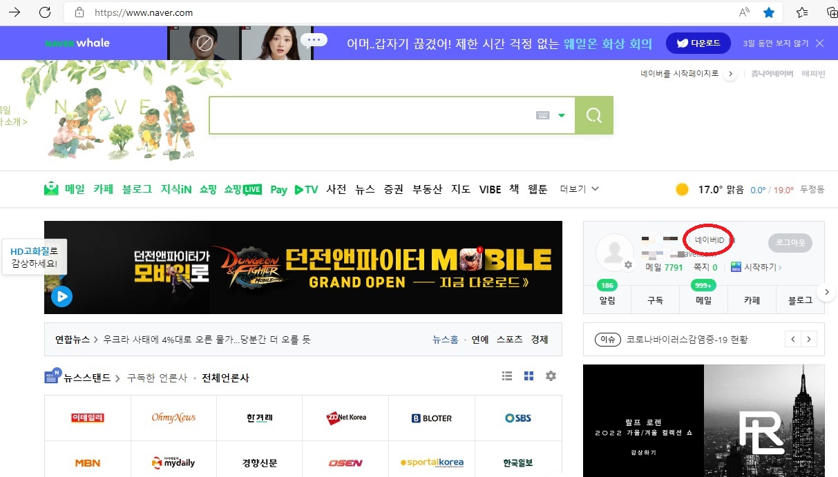 PC에서 네이버 로그인 후 아이디 옆의 [네이버ID]를 클릭합니다.