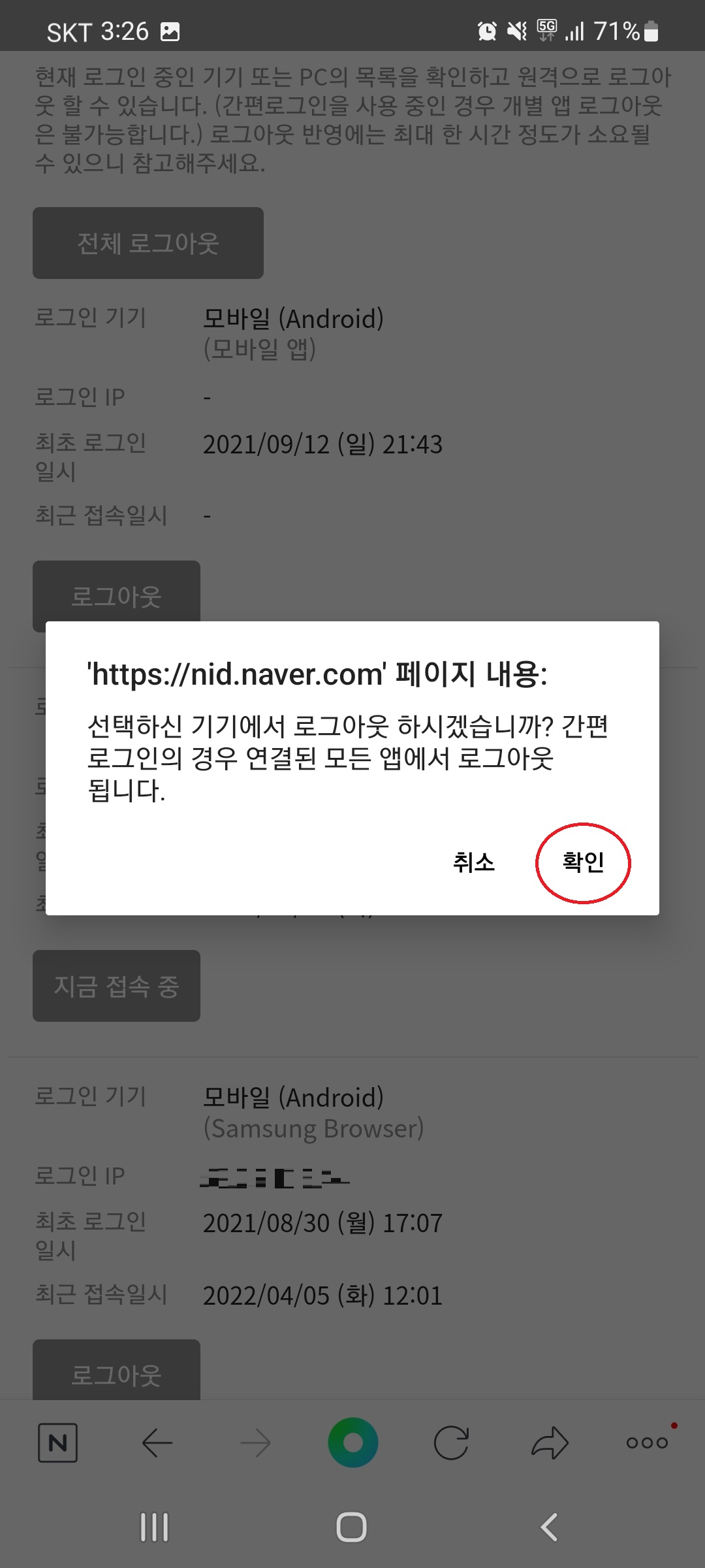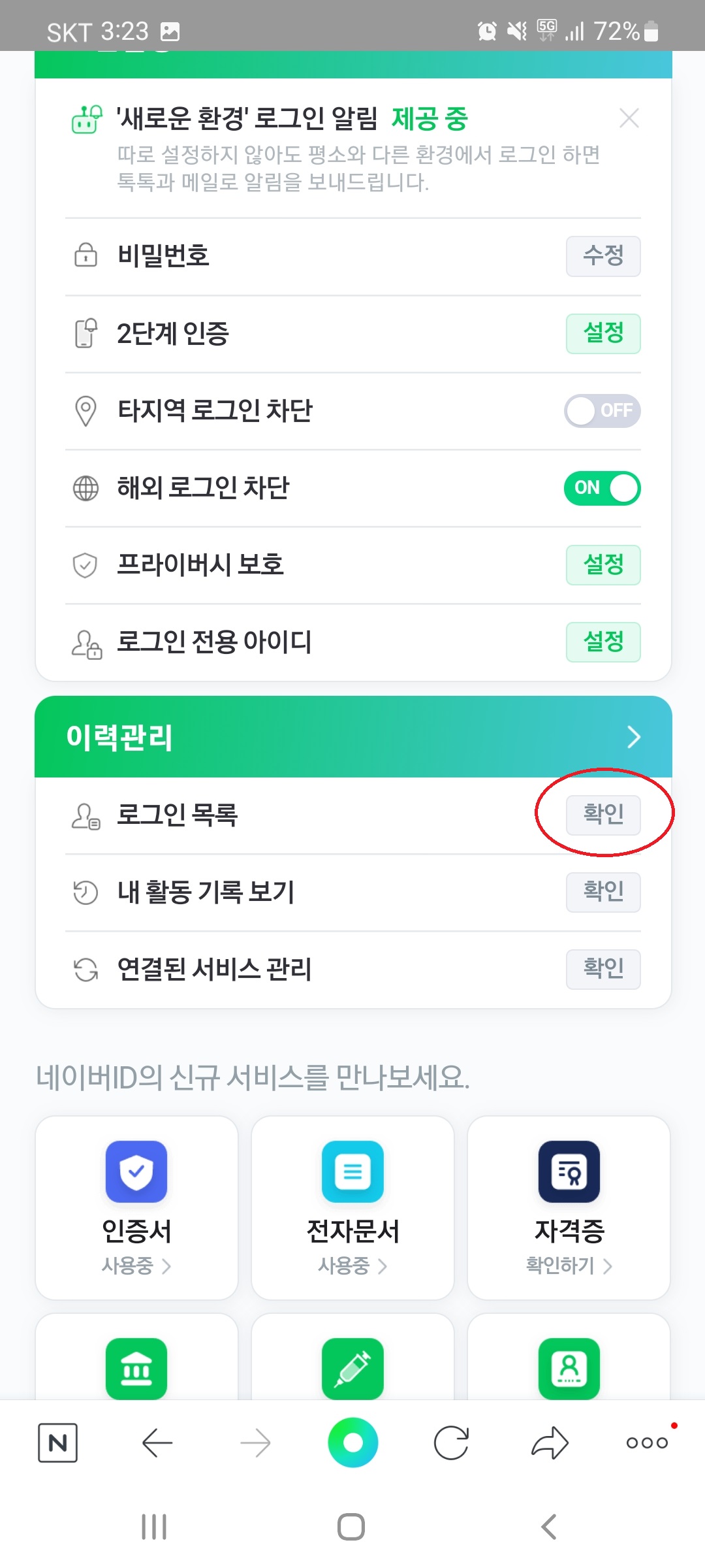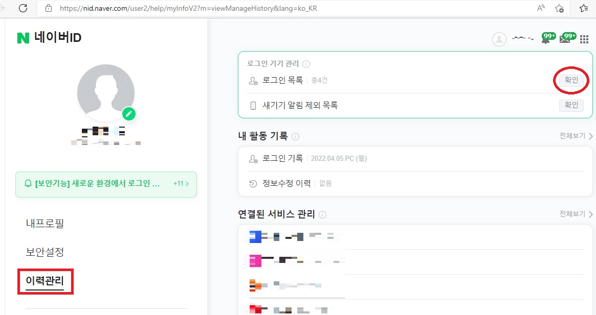 로그인 기기 관리 > 로그인 목록 옆의 [확인]을 클릭합니다.