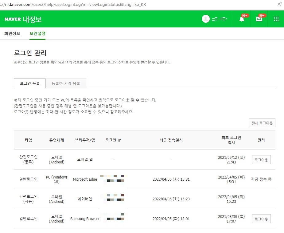 [전체 로그아웃]을 선택하여 모두 로그아웃 하거나, 개별 [로그아웃]을 선택하여 원하는 기기에서만 로그아웃 할 수 있습니다. 로그아웃 반영에는 최대 한 시간이 소요될 수 있다고 하니 참고해주세요.