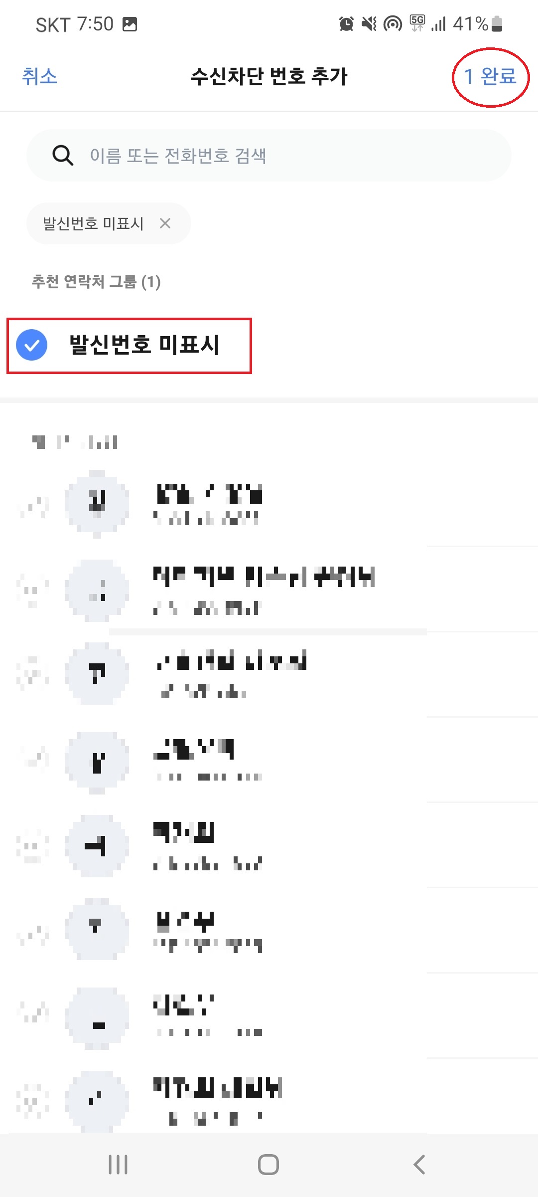 [발신번호 미표시]를 체크하여 활성화하고 상단의 [완료]를 선택합니다.