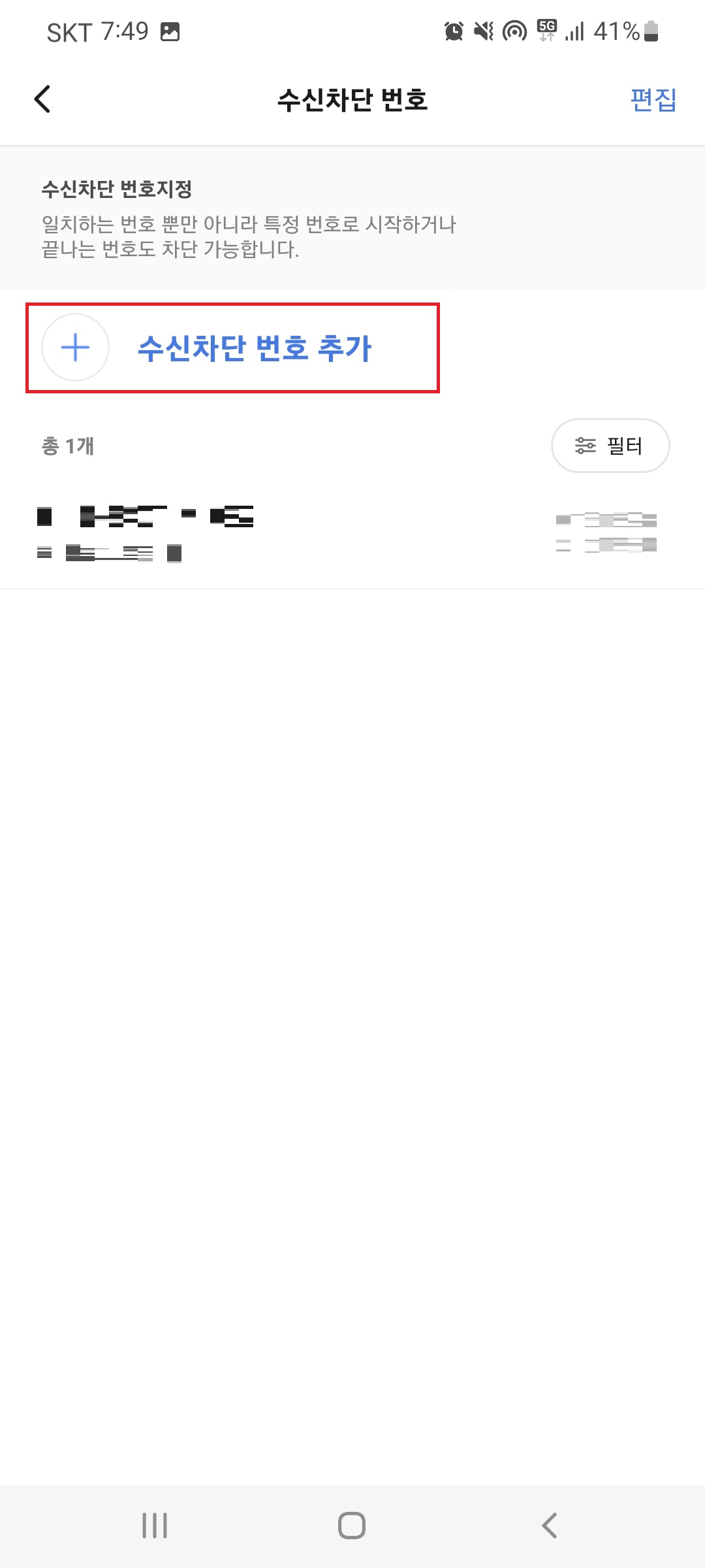 [수신차단] 선택 후, 다음 화면에서 [수신차단 번호 추가]를 선택합니다.