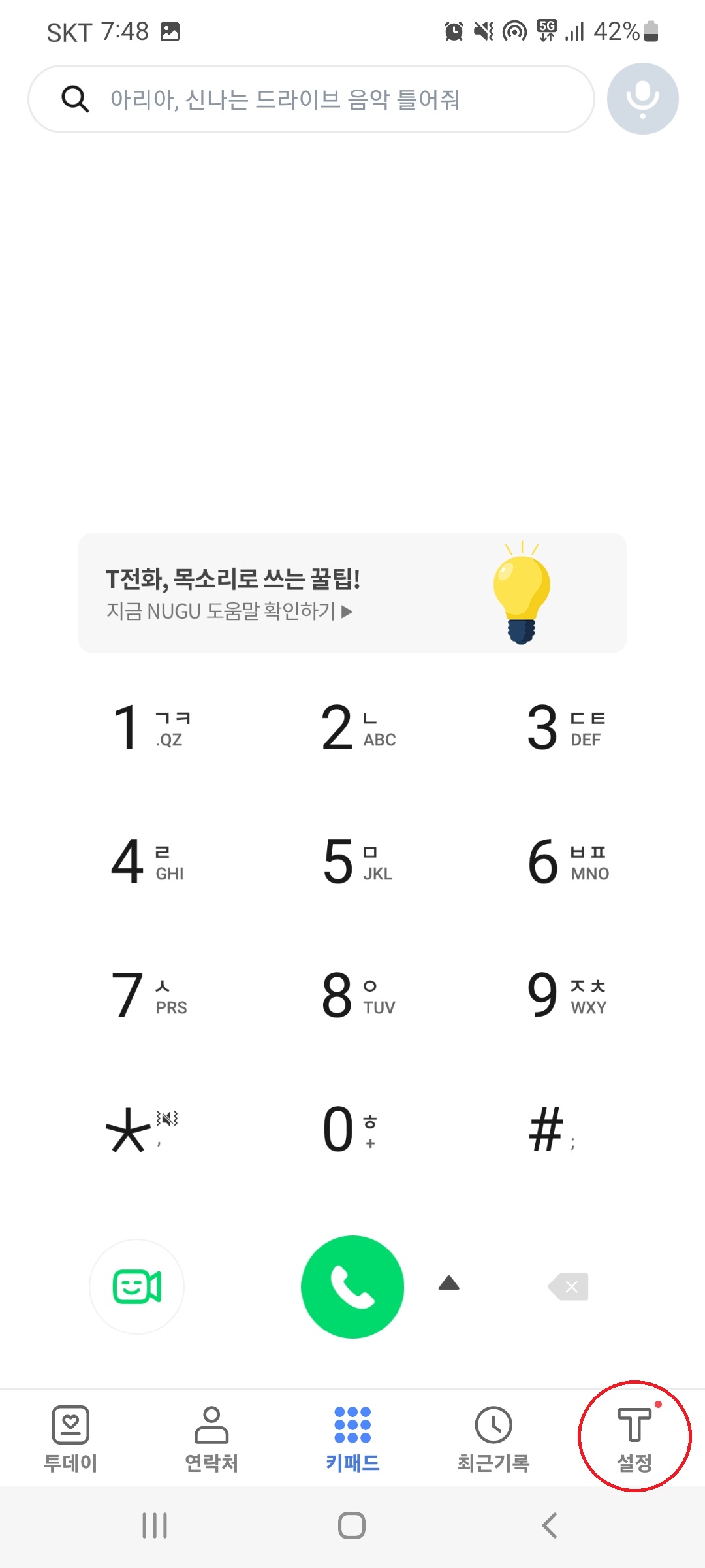 T전화 앱 우측 하단의 [설정]을 선택한 후,