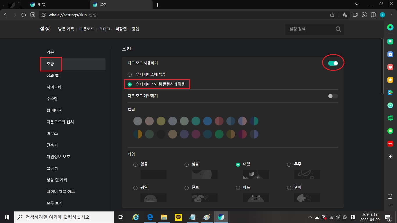 ※ [인터페이스와 웹 콘텐츠에 적용]을 체크해야 모든 페이지에 다크모드가 적용됩니다.