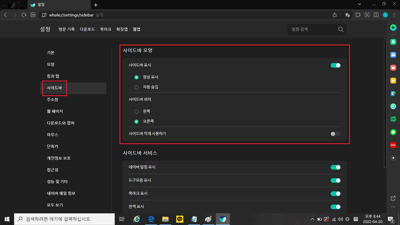 네이버 웨일은 사이드바를 제공하는데요.