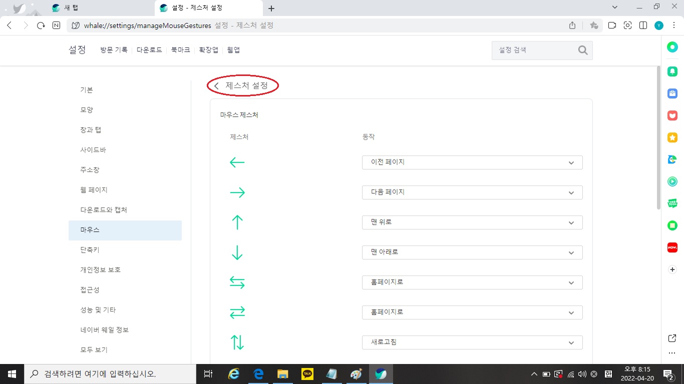 마우스 제스처 설정 및 해제는 주소창 옆의 더보기(...) > 설정 > 마우스 > 마우스 제스처 탭에서 가능합니다.