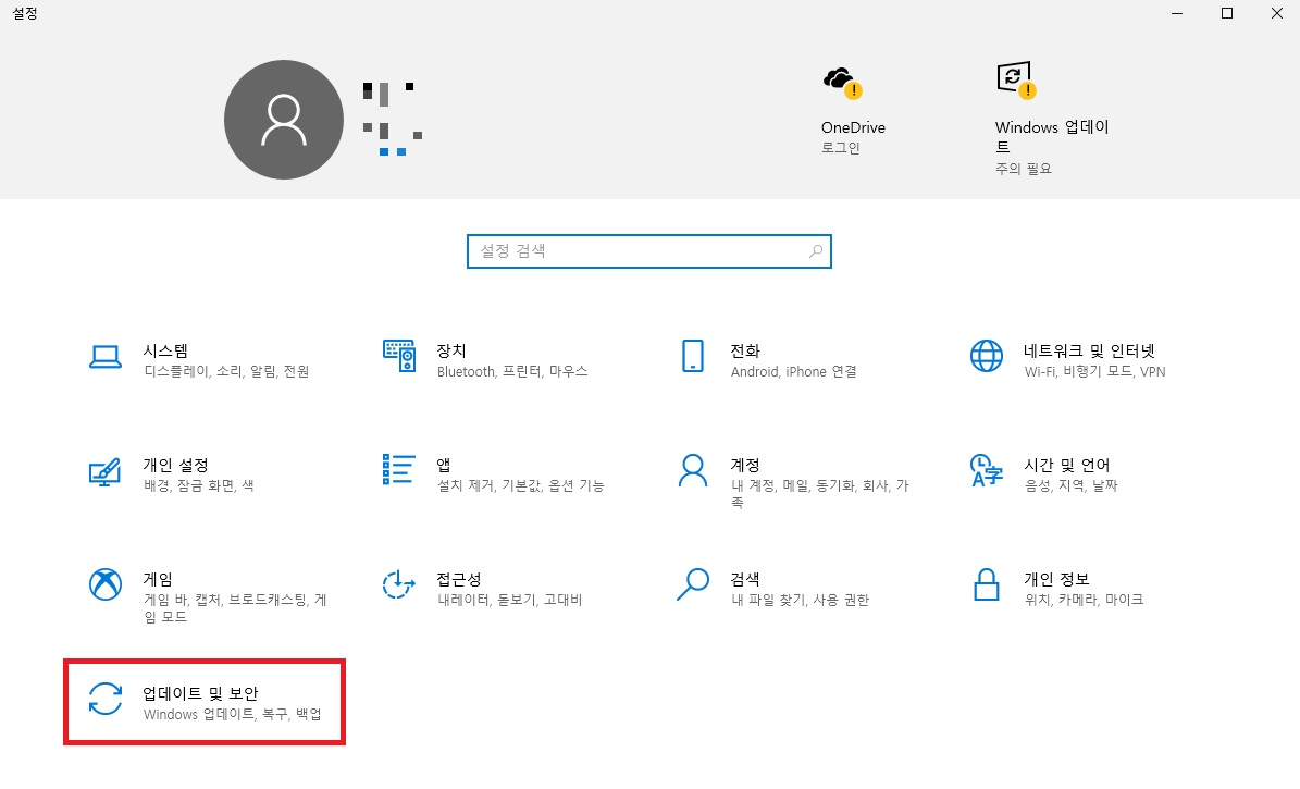 설정 창에서 [업데이트 및 보안]을 선택합니다.