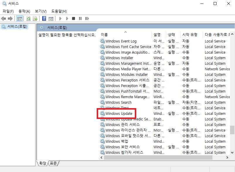 위와 같은 서비스 창이 뜨면 윈도우 업데이트를 선택합니다.