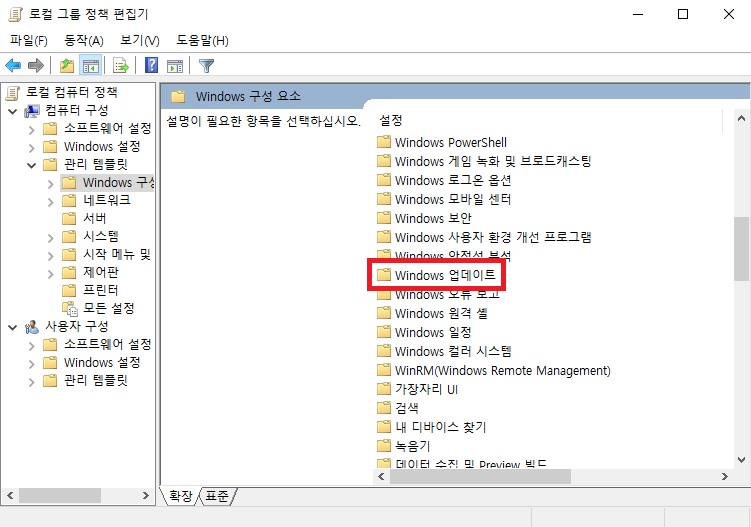 위와 같은 창이 뜨면 컴퓨터 구성 > 관리 템플릿 > 윈도우 구성 요소를 선택합니다.