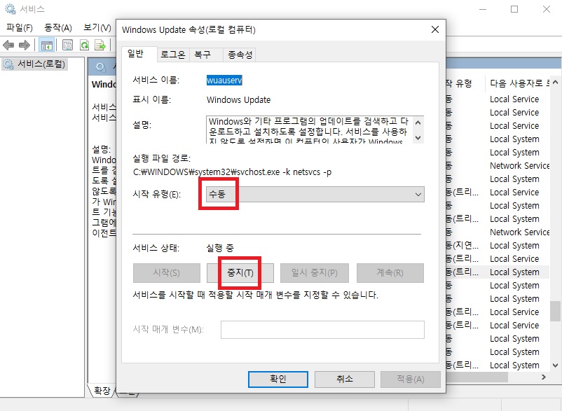 시작 유형을 [수동]으로 변경한 후 [중지]를 선택하면 설정 완료입니다.