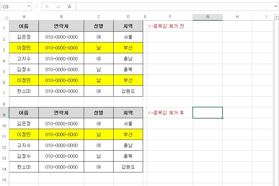 그럼 위와 같이 중복됐던 '이정민' 내용이 제거된 것을 확인할 수 있습니다.