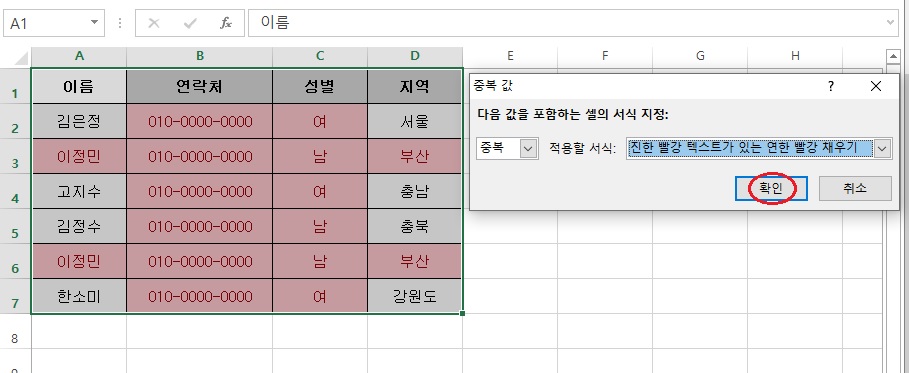 그럼 위와 같이 중복값 창이 뜨고, [확인]을 선택하면 중복값이 표시됩니다.