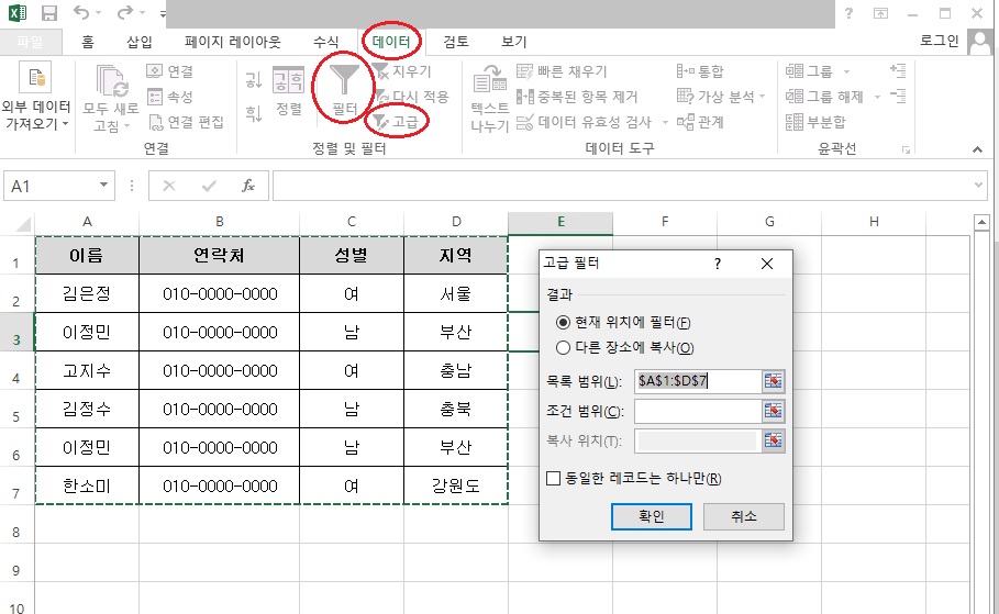고급 필터를 이용해 중복값 제거하기