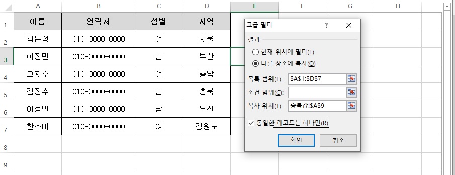 3. 복사 위치 : 중복값 제거 후의 표를 어느 위치에 복사할지 선택합니다. 다른 시트에 위치를 선택해도 됩니다.