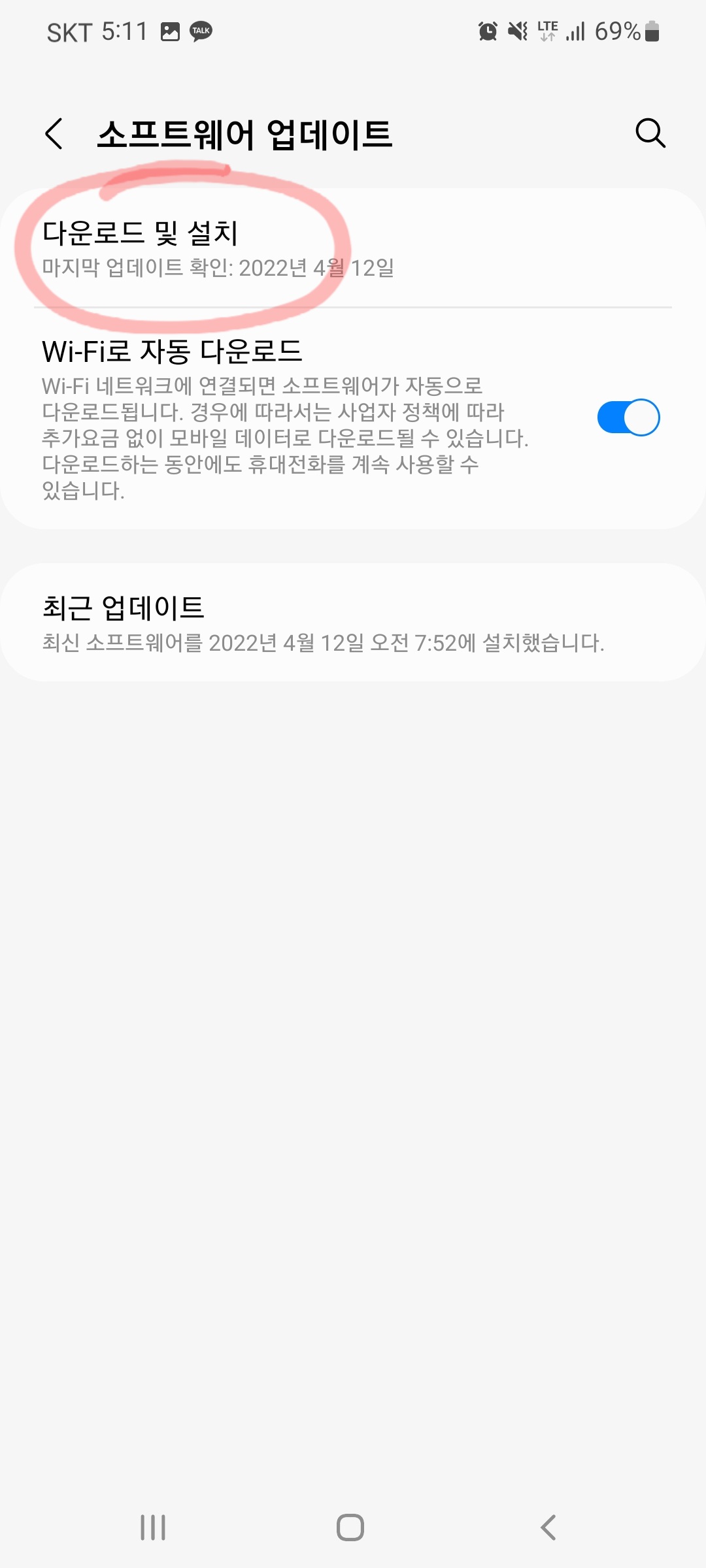 다음 화면에서 다운로드 및 설치를 선택하면 내 휴대폰의 현재 소프트웨어 버전을 확인할 수 있습니다.