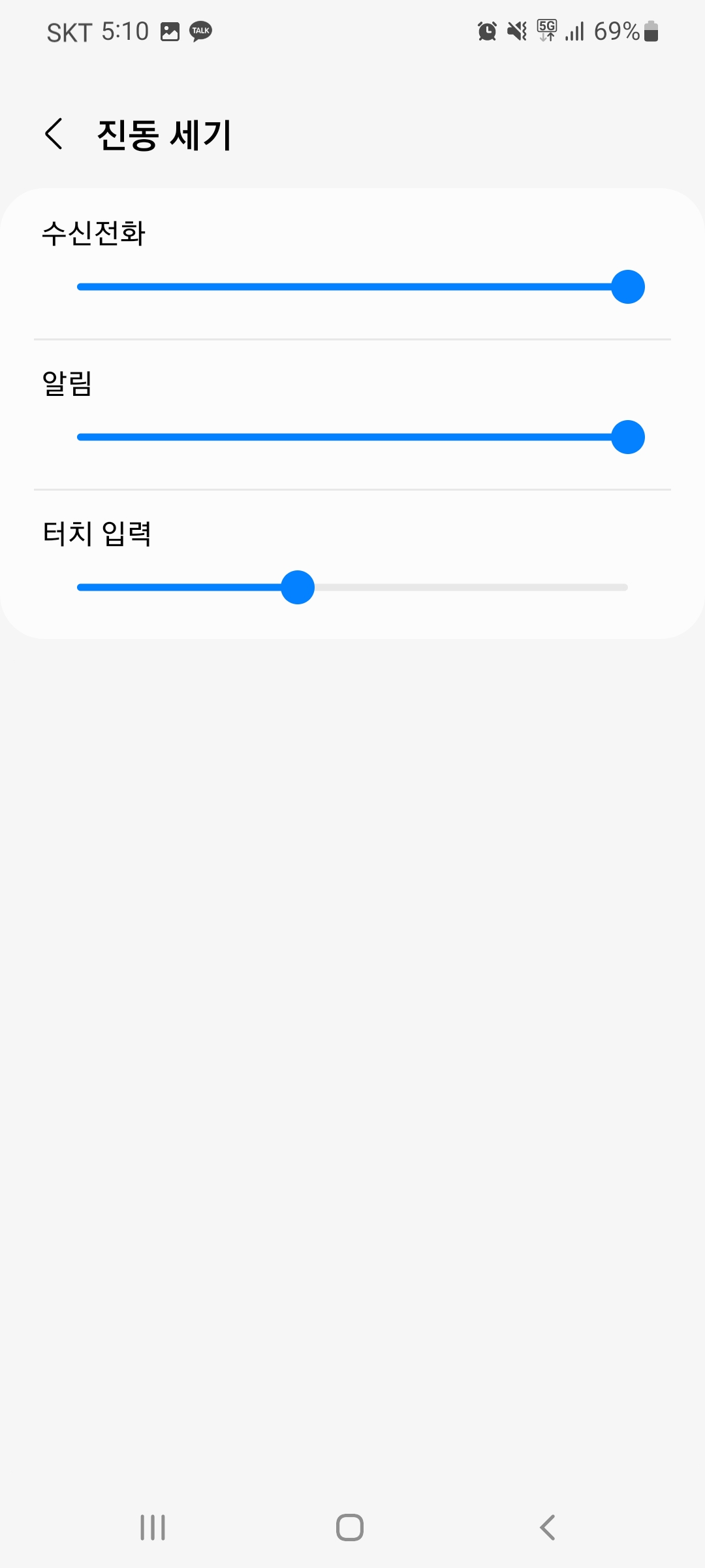갤럭시 스마트폰에서는 수신전화, 알림, 터치 입력의 진동 세기를 각각 조절할 수 있습니다.