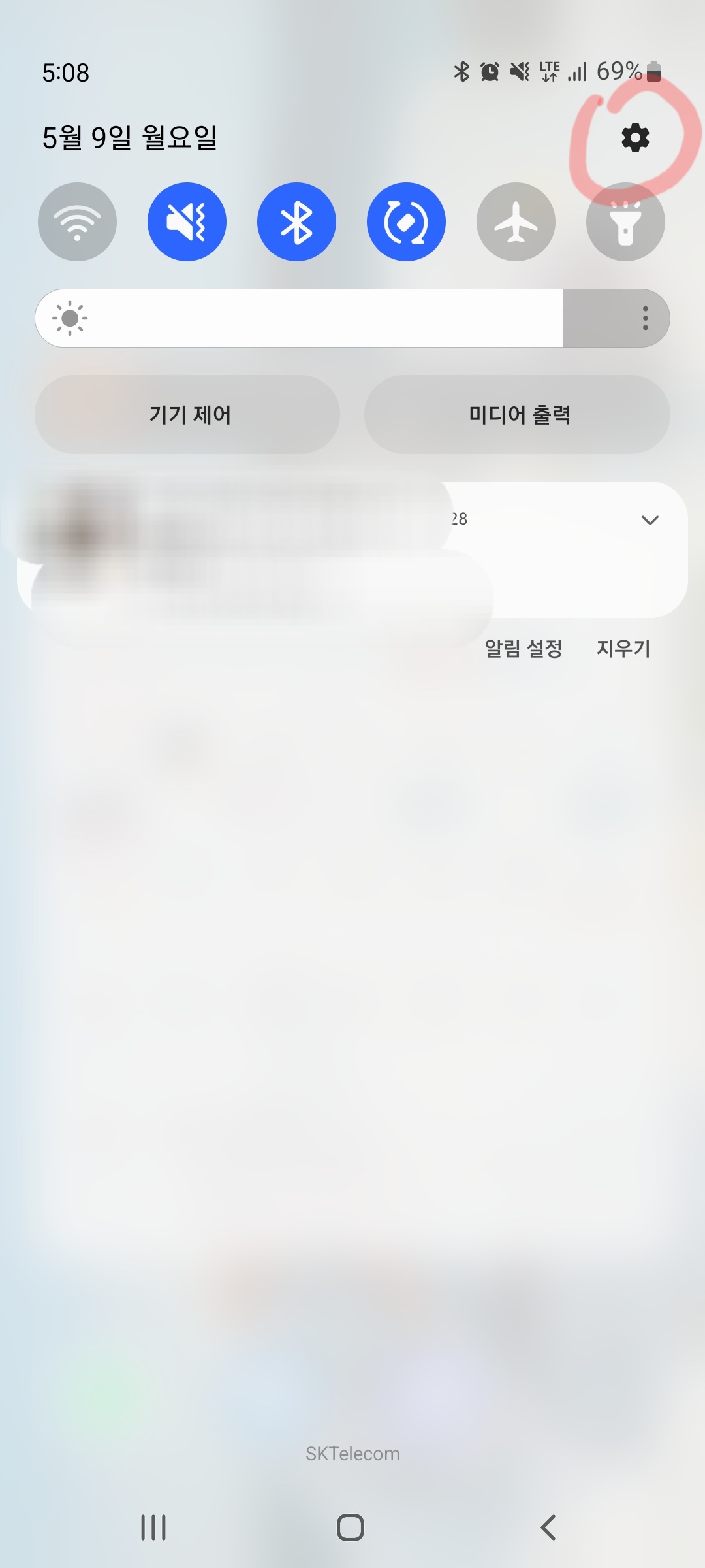 휴대폰 화면 상단의 상태표시줄(상단바)을 아래쪽으로 내려 톱니바퀴 모양의 아이콘을 선택하면 설정으로 들어갈 수 있습니다.