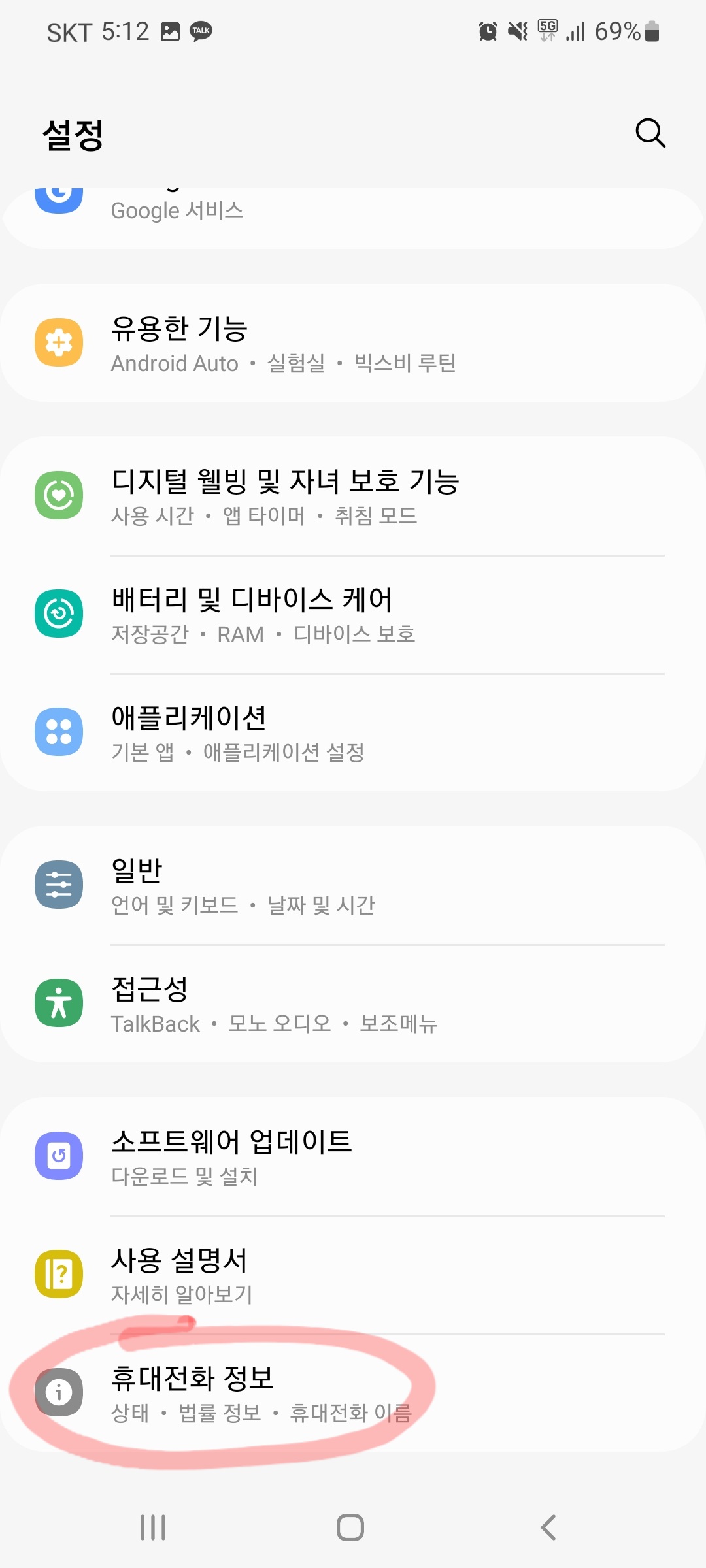 휴대폰 설정으로 들어가 화면을 아래로 스크롤하여 휴대전화 정보 메뉴에 들어갑니다.