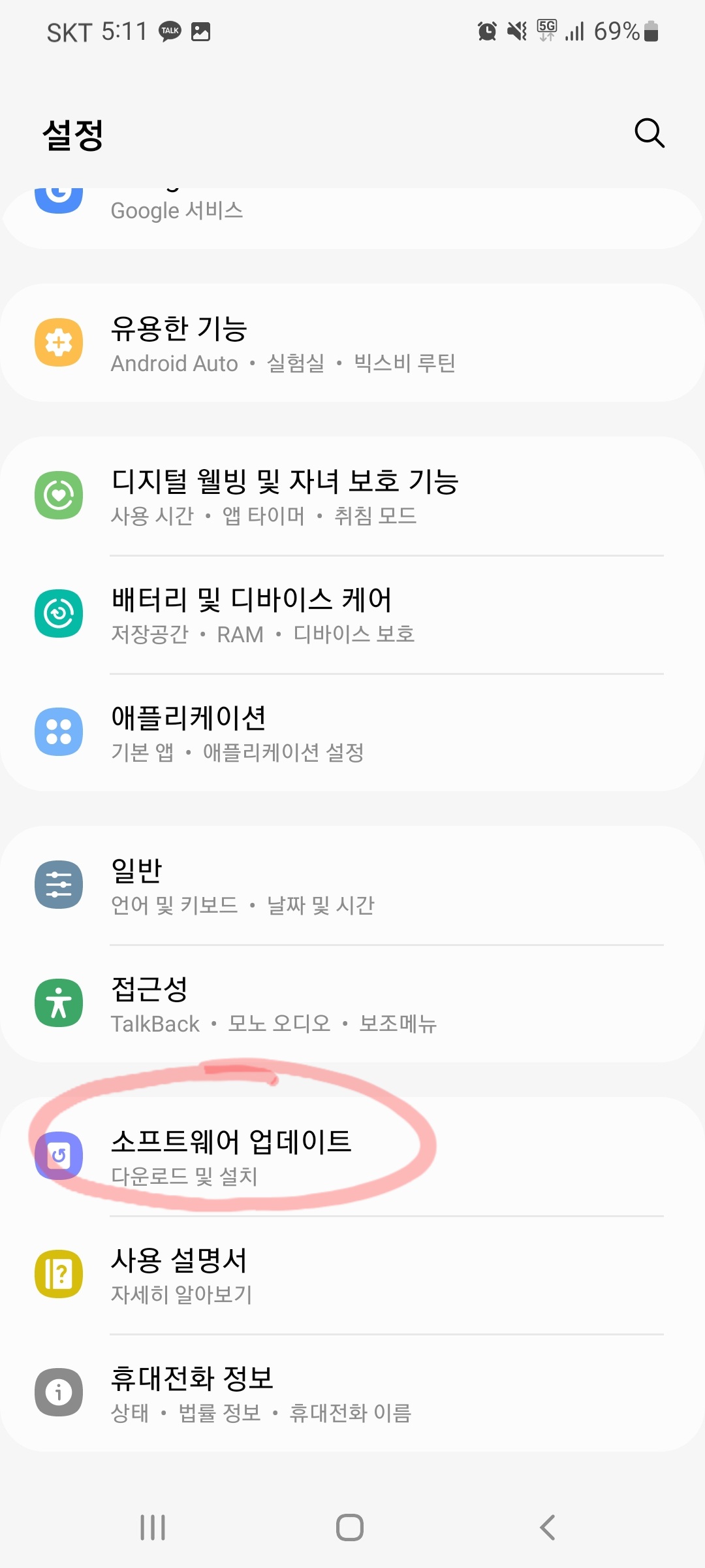 휴대폰 설정으로 들어가 화면을 아래로 스크롤하여 소프트웨어 업데이트 메뉴를 선택하세요.