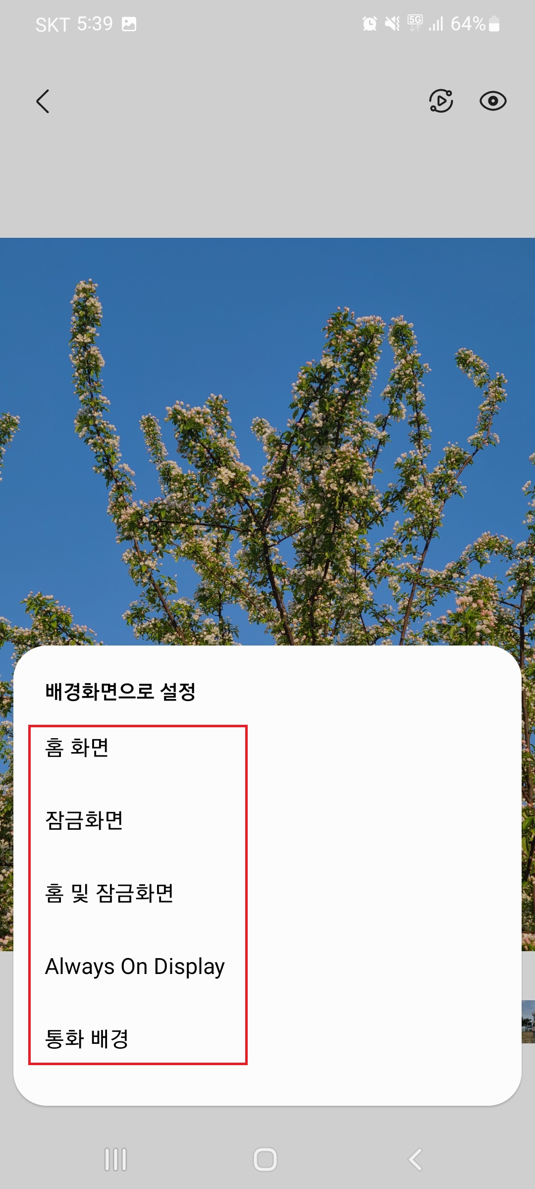 홈 화면, 잠금화면, 홈 및 잠금화면, Always On Display, 통화 배경 중에서 선택할 수 있습니다.