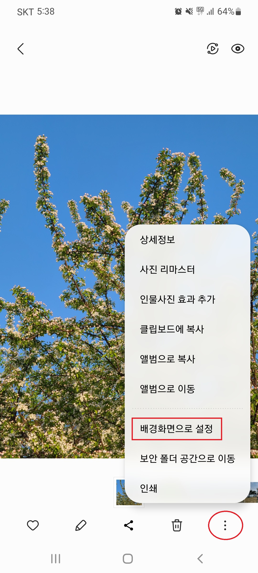 사진 우측 하단의 더보기(...) 아이콘을 선택한 후 [배경화면으로 설정]을 선택합니다.