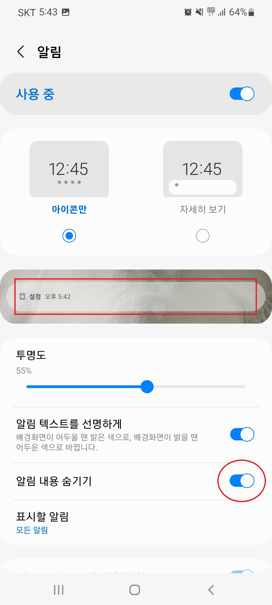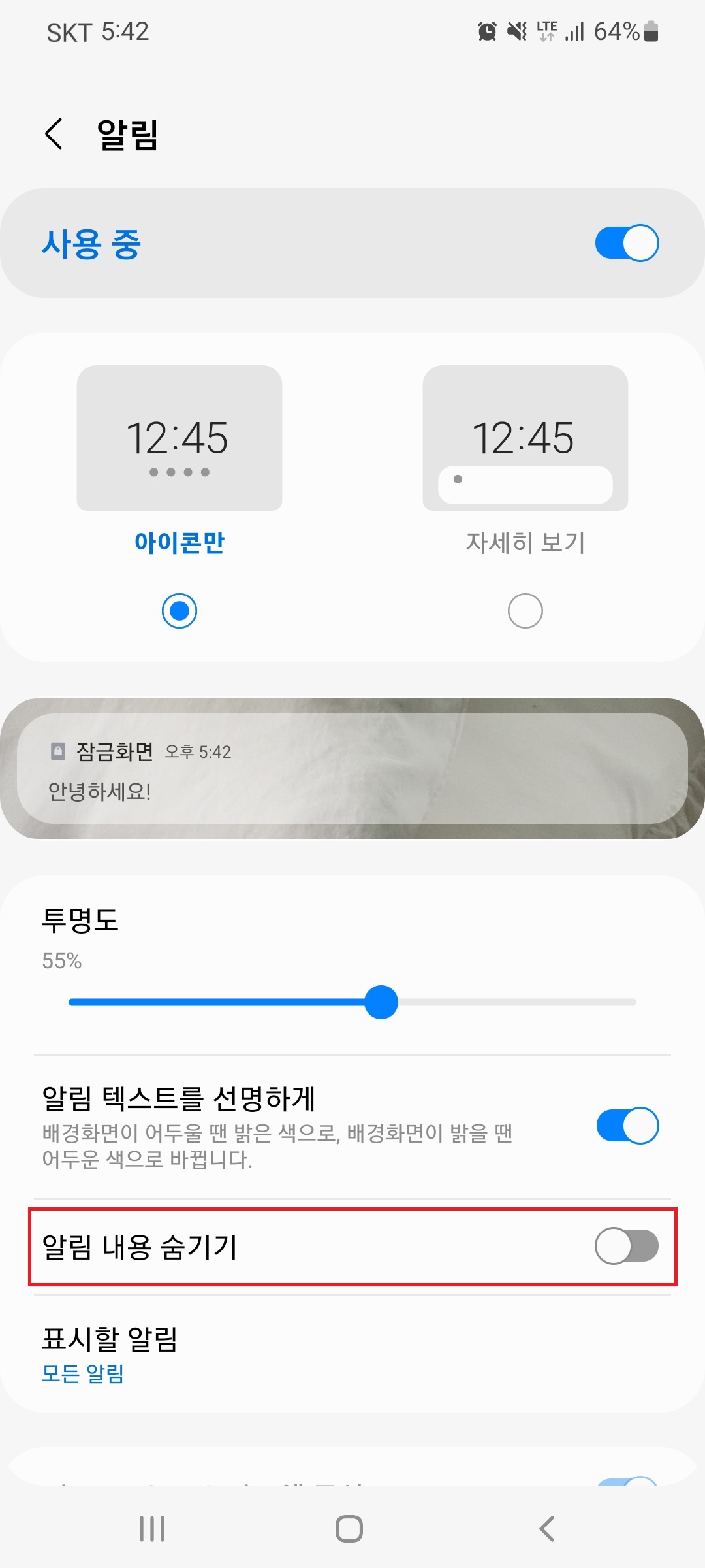 잠금화면에 알림 아이콘만 뜨고 내용은 숨기려면 [알림 내용 숨기기]를 활성화하면 됩니다.